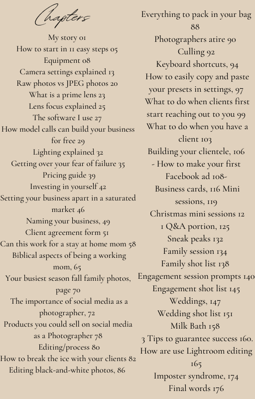 Designed for beginners and enthusiasts alike, this photography guide unravels the mysteries of composition, lighting, and technique, empowering you to master the art of photography while giving you financial freedom. I wrote this guide after 2 1/2 years of owning my own photography business after starting from a place of having zero experience with cameras and computers alike. Unleash your artistic vision with confidence, understanding exposure, depth of field, and post-processing techniques. Whether you aspire to create stunning images for personal enjoyment or pursue a professional career, my photography guide is the perfect companion on your visual journey.